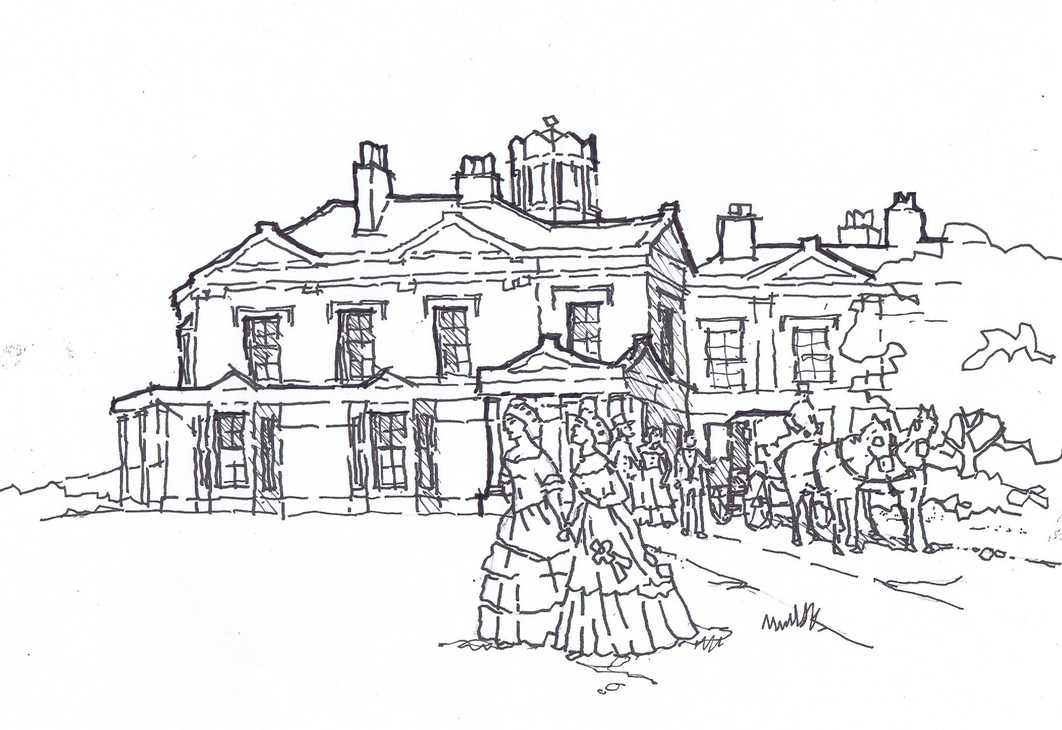 Amid this catastrophe, TWB (junior) and his family simply walked away. They left Velindre and set up home in a swanky house in Southerndown, overlooking the sea (but still with lots of servants to help). The sketch below shows Velindre at the time, perhaps with the elegant daughters having a lingering last look before leaving